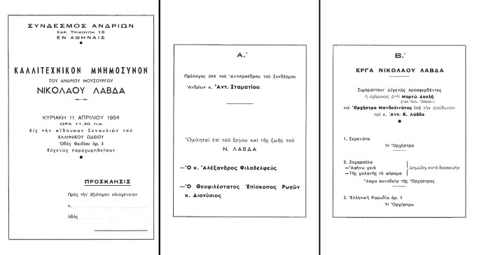 The program of a concert in memory of N Lavdas, from March 11, 1954. Alexander Philadelpheus and Bishop Dionysios Psarianos speak, and Ant.K. Lavdas conducts an (ad hoc?) Mandolin Orchestra, with soprano Myrto Douli.